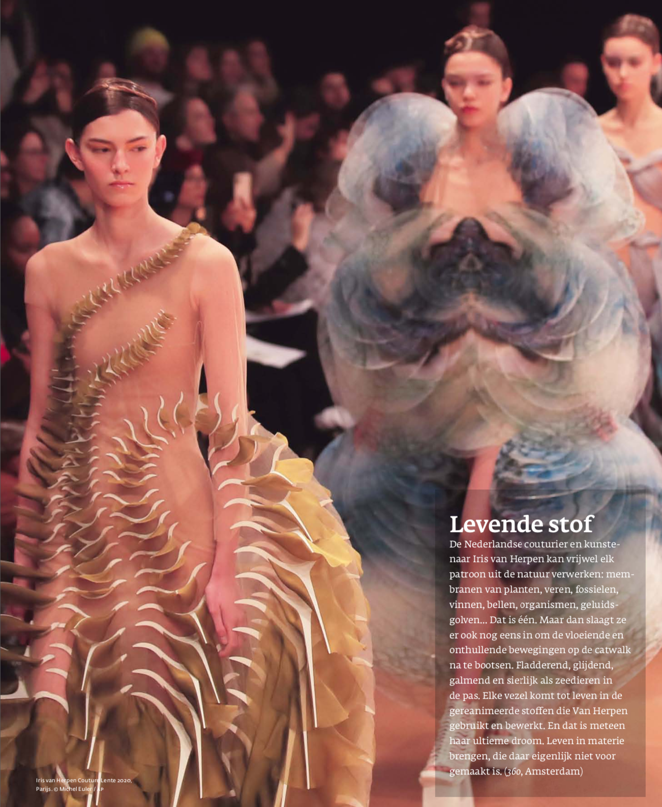 De Nederlandse couturier en kunste- naar Iris van Herpen kan vrijwel elk patroon uit de natuur verwerken: mem- branen van planten, veren, fossielen, vinnen, bellen, organismen, geluids- golven… Dat is één. Maar dan slaagt ze er ook nog eens in om de vloeiende en onthullende bewegingen op de catwalk na te bootsen. Fladderend, glijdend, galmend en sierlijk als zeedieren in de pas. Elke vezel komt tot leven in de gereanimeerde stoffen die Van Herpen gebruikt en bewerkt. En dat is meteen haar ultieme droom. Leven in materie brengen, die daar eigenlijk niet voor gemaakt is.