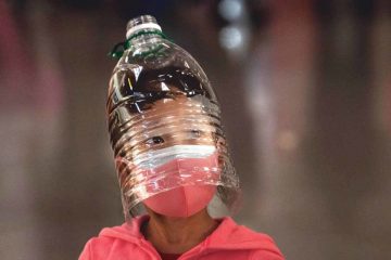 Reader | Een meisje op de luchthaven van Beijing draagt een zelf geknutseld masker van een plastic fles en twee mondkapjes over elkaar om zich te beschermen tegen het coronavirus.